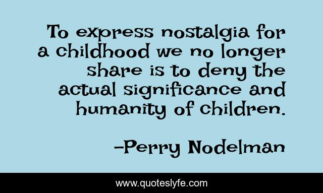 This page presents the quote "To express nostalgia for a childhood we no longer share is to deny the actual significance and humanity of children.". Author of this quote is Perry Nodelman. This quote is about deconstruction, childhood, innocence,.