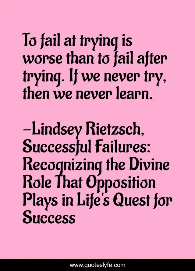 This page presents the quote "To fail at trying is worse than to fail after trying. If we never try, then we never learn.". Author of this quote is Lindsey Rietzsch, Successful Failures: Recognizing the Divine Role That Opposition Plays in Life's Quest for Success. This quote is about confidence, success, positive, motivational, failure, optimistic, inspirational, failure-and-success, enthusiasm,.