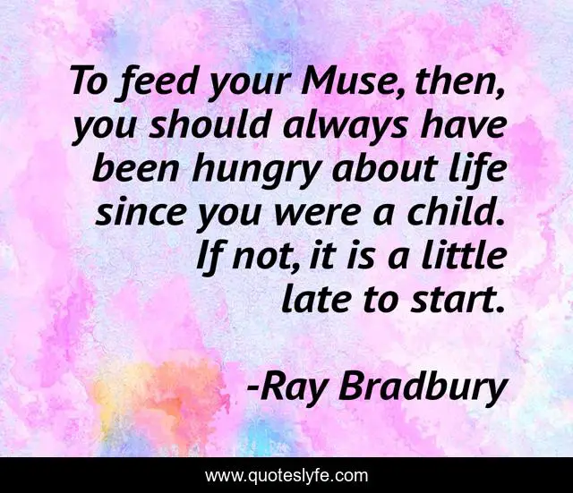 This page presents the quote "To feed your Muse, then, you should always have been hungry about life since you were a child. If not, it is a little late to start.". Author of this quote is Ray Bradbury. This quote is about muse, writing,.