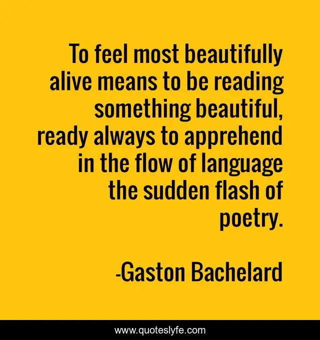 This page presents the quote "To feel most beautifully alive means to be reading something beautiful, ready always to apprehend in the flow of language the sudden flash of poetry.". Author of this quote is Gaston Bachelard. This quote is about literature, language, poetry, books, words, reading,.
