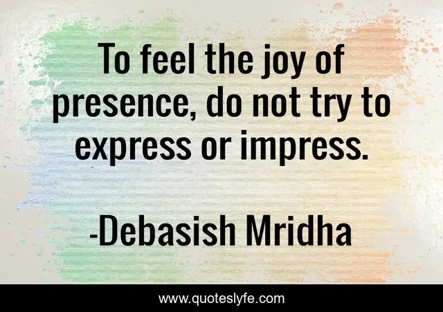This page presents the quote "To feel the joy of presence, do not try to express or impress.". Author of this quote is Debasish Mridha. This quote is about joy-of-presence, debasish, debasish-mridha, philosophy, impress, inspirational, mridha, enthusiasm, do-not-try-to-express-or-impress,.