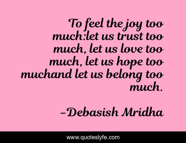 This page presents the quote "To feel the joy too much:let us trust too much, let us love too much, let us hope too muchand let us belong too much.". Author of this quote is Debasish Mridha. This quote is about belong, love, joy, debasish, debasish-mridha, affection, mridha, trust, philosophy,.