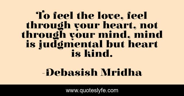 This page presents the quote "To feel the love, feel through your heart, not through your mind, mind is judgmental but heart is kind.". Author of this quote is Debasish Mridha. This quote is about life, love, knowledge, inspirational, intelligence, philosophy, wisdom, quotes, affection,.