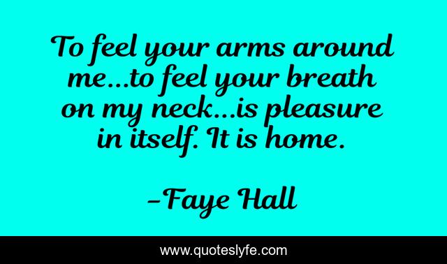 This page presents the quote "To feel your arms around me...to feel your breath on my neck...is pleasure in itself. It is home.". Author of this quote is Faye Hall. This quote is about love, neck, soulmates, arms, breath, home, pleasure, affection,.