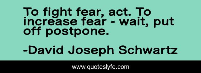 This page presents the quote "To fight fear, act. To increase fear - wait, put off postpone.". Author of this quote is David Joseph Schwartz. This quote is about fight, act, wait,.