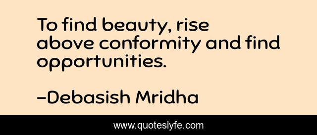 This page presents the quote "To find beauty, rise above conformity and find opportunities.". Author of this quote is Debasish Mridha. This quote is about philosophy, beauty, find-opportunities, debasish-mridha, quotes, inspirational, find-beauty, enthusiasm, conformity,.