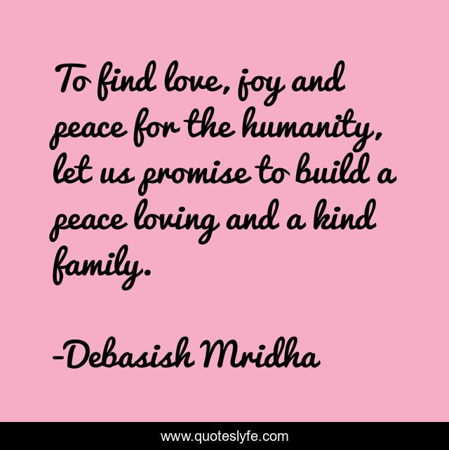 This page presents the quote "To find love, joy and peace for the humanity, let us promise to build a peace loving and a kind family.". Author of this quote is Debasish Mridha. This quote is about life, love, knowledge, inspirational, intelligence, philosophy, wisdom, quotes, affection,.
