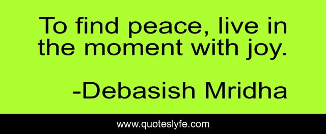 This page presents the quote "To find peace, live in the moment with joy.". Author of this quote is Debasish Mridha. This quote is about philosophy, peace, debasish-mridha, quotes, inspirational, enthusiasm, debasish-mridha-m-d, live-in-the-moment,.