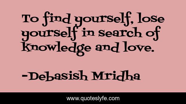 This page presents the quote "To find yourself, lose yourself in search of knowledge and love.". Author of this quote is Debasish Mridha. This quote is about search-of-love, philosophy, search-of-knowledge, mridha, debasish, debasish-mridha, find-yourself, lose-yourself,.