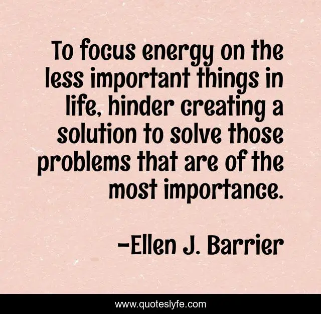 This page presents the quote "To focus energy on the less important things in life, hinder creating a solution to solve those problems that are of the most importance.". Author of this quote is Ellen J. Barrier. This quote is about problems, solution,.