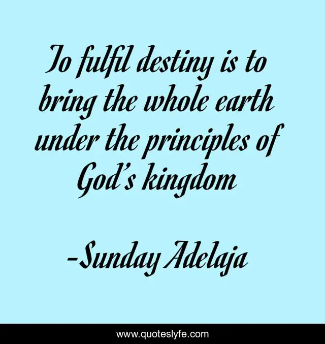 This page presents the quote "To fulfil destiny is to bring the whole earth under the principles of God’s kingdom". Author of this quote is Sunday Adelaja. This quote is about fulfil, earth, kingdom, destiny, principle,.