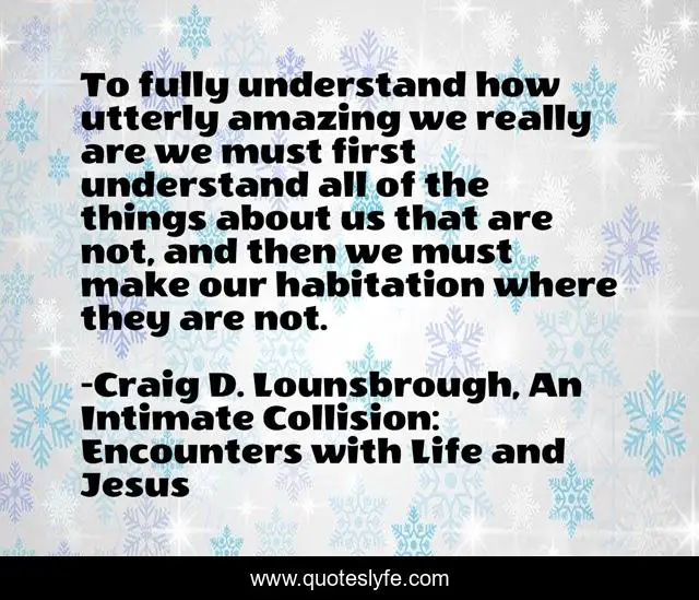 This page presents the quote "To fully understand how utterly amazing we really are we must first understand all of the things about us that are not, and then we must make our habitation where they are not.". Author of this quote is Craig D. Lounsbrough, An Intimate Collision: Encounters with Life and Jesus. This quote is about self-confidence, characteristics, us, maturity, amazing, growth, qualities, habitation, ourselves,.