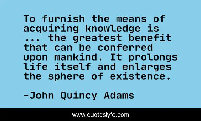 This page presents the quote "To furnish the means of acquiring knowledge is ... the greatest benefit that can be conferred upon mankind. It prolongs life itself and enlarges the sphere of existence.". Author of this quote is John Quincy Adams. This quote is about prolong, benefit, knowledge,.