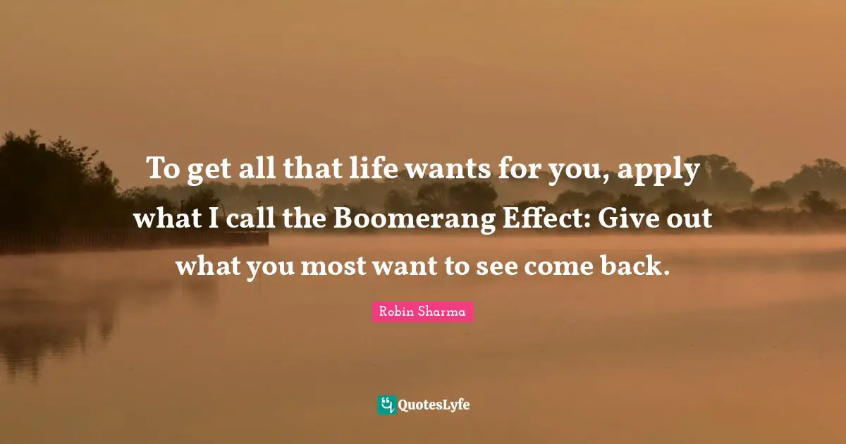 This page presents the quote "To get all that life wants for you, apply what I call the Boomerang Effect: Give out what you most want to see come back.". Author of this quote is Robin Sharma. This quote is about giving, life, want, boomerang,.