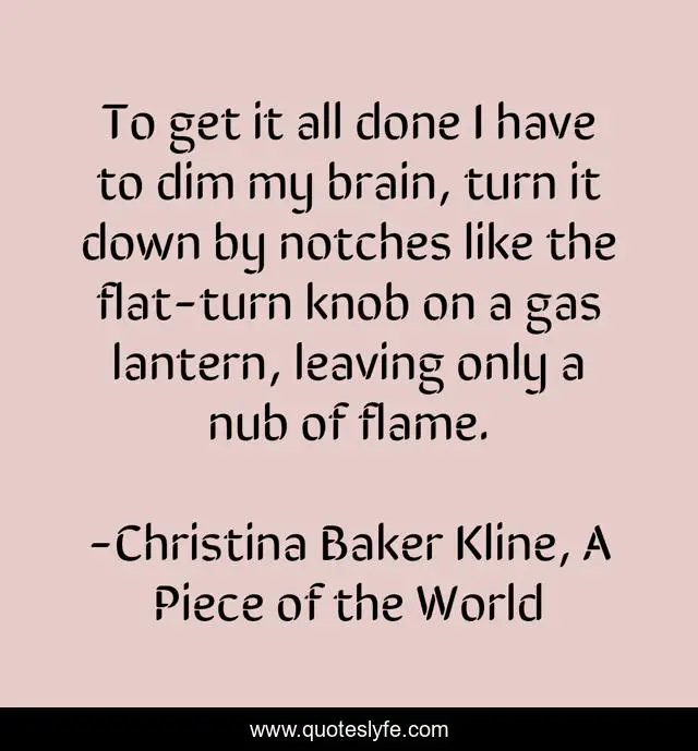 This page presents the quote "To get it all done I have to dim my brain, turn it down by notches like the flat-turn knob on a gas lantern, leaving only a nub of flame.". Author of this quote is Christina Baker Kline, A Piece of the World. This quote is about thinking, overthinking, contemplating,.