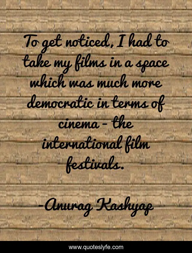 This page presents the quote "To get noticed, I had to take my films in a space which was much more democratic in terms of cinema - the international film festivals.". Author of this quote is Anurag Kashyap. This quote is about festivals, cinema,.