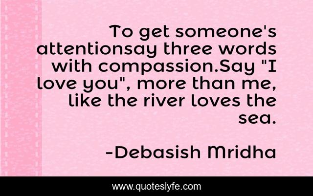 This page presents the quote "To get someone's attentionsay three words with compassion.Say "I love you", more than me, like the river loves the sea.". Author of this quote is Debasish Mridha. This quote is about life, love, knowledge, inspirational, intelligence, philosophy, wisdom, quotes, affection,.