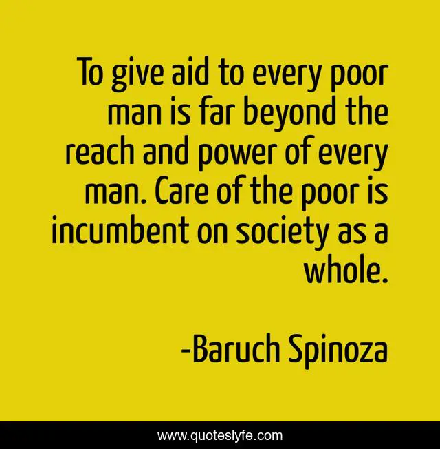 This page presents the quote "To give aid to every poor man is far beyond the reach and power of every man. Care of the poor is incumbent on society as a whole.". Author of this quote is Baruch Spinoza. This quote is about society, man, care,.