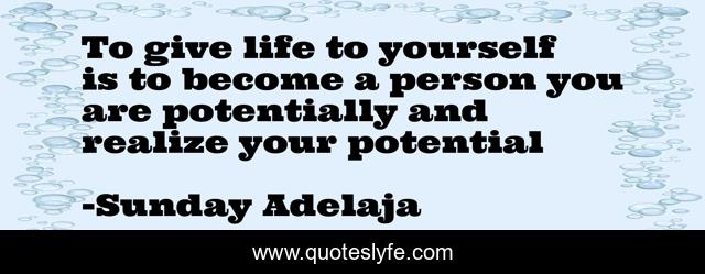 This page presents the quote "To give life to yourself is to become a person you are potentially and realize your potential". Author of this quote is Sunday Adelaja. This quote is about life, people, self-discovery, potential, world, personality,.