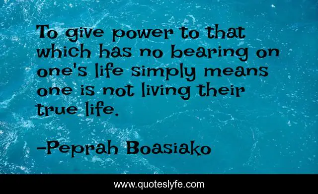 This page presents the quote "To give power to that which has no bearing on one's life simply means one is not living their true life.". Author of this quote is Peprah Boasiako. This quote is about living, life, self-awareness, self, self-realization, living-life, life-lessons, living-life-to-the-fullest, life-and-living,.