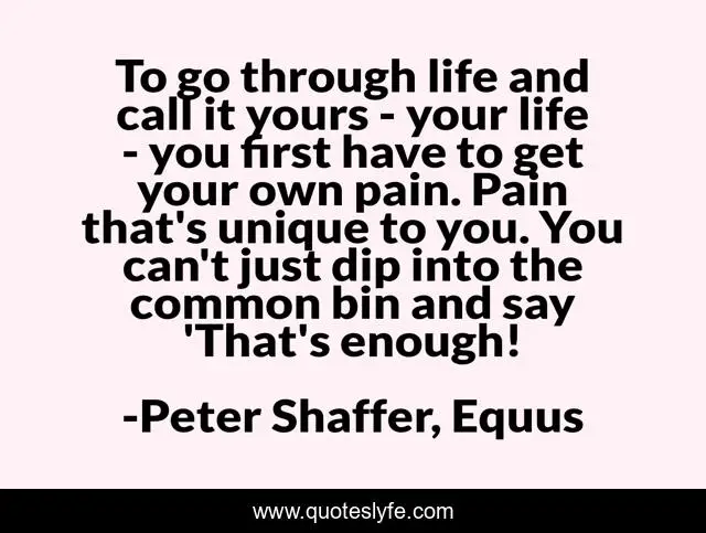 This page presents the quote "To go through life and call it yours - your life - you first have to get your own pain. Pain that's unique to you. You can't just dip into the common bin and say 'That's enough!". Author of this quote is Peter Shaffer, Equus. This quote is about life, pain,.