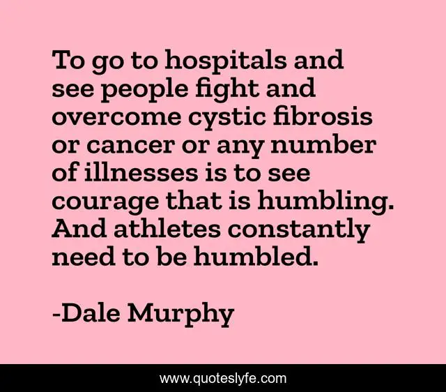 This page presents the quote "To go to hospitals and see people fight and overcome cystic fibrosis or cancer or any number of illnesses is to see courage that is humbling. And athletes constantly need to be humbled.". Author of this quote is Dale Murphy. This quote is about fight, cancer, people,.