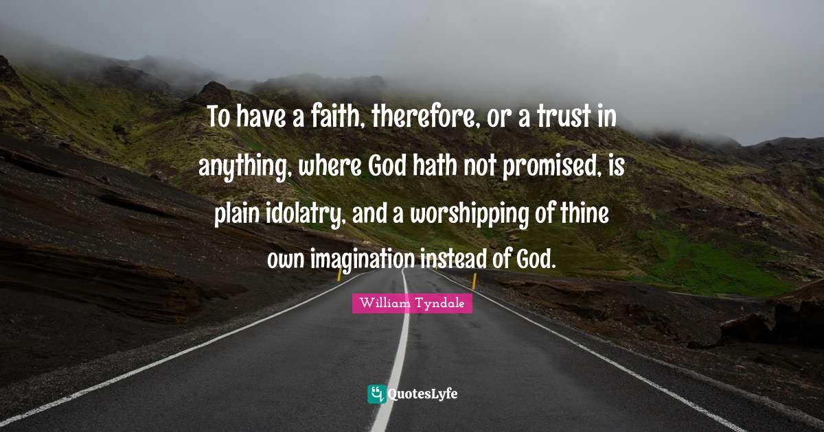 This page presents the quote "To have a faith, therefore, or a trust in anything, where God hath not promised, is plain idolatry, and a worshipping of thine own imagination instead of God.". Author of this quote is William Tyndale. This quote is about faith, trust, idolatry, god, imagination,.