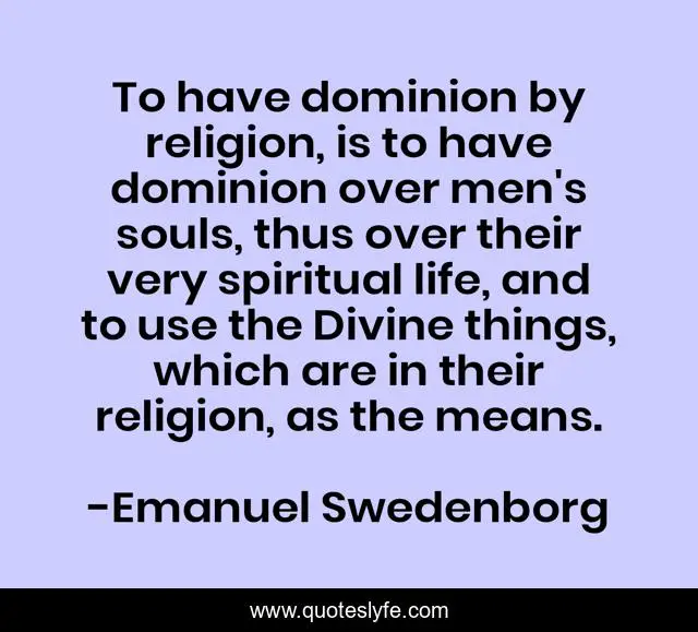 This page presents the quote "To have dominion by religion, is to have dominion over men's souls, thus over their very spiritual life, and to use the Divine things, which are in their religion, as the means.". Author of this quote is Emanuel Swedenborg. This quote is about life, men, spiritual,.