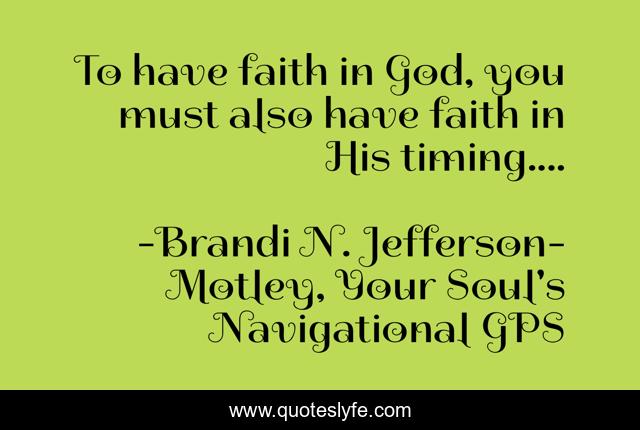 This page presents the quote "To have faith in God, you must also have faith in His timing....". Author of this quote is Brandi N. Jefferson-Motley, Your Soul's Navigational GPS. This quote is about enthusiasm, inspirational,.