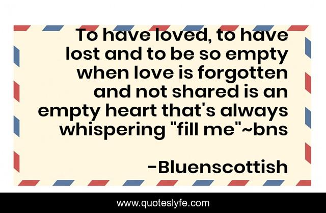 This page presents the quote "To have loved, to have lost and to be so empty when love is forgotten and not shared is an empty heart that's always whispering "fill me"~bns". Author of this quote is Bluenscottish. This quote is about broken-heart, heart, love, couples, sadness, bluenscottish, partner, affection,.