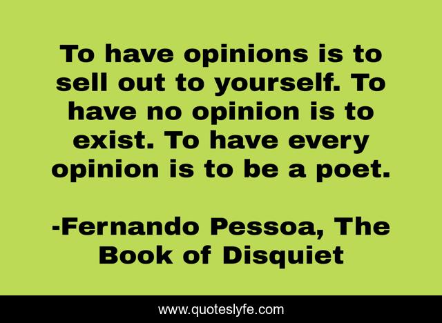 "Fernando Pessoa, The Book of Disquiet Quotes." Quoteslyfe.com, 2025. Tue. 09 Dec. 2025. <https://www.quoteslyfe.com/quote/To-have-opinions-is-to-sell-out-13001>.