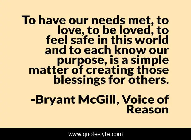 This page presents the quote "To have our needs met, to love, to be loved, to feel safe in this world and to each know our purpose, is a simple matter of creating those blessings for others.". Author of this quote is Bryant McGill, Voice of Reason. This quote is about blessing, love, safe, purpose-of-living, affection, to-be-loved,.