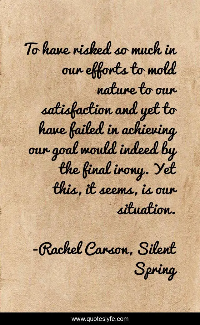 This page presents the quote "To have risked so much in our efforts to mold nature to our satisfaction and yet to have failed in achieving our goal would indeed by the final irony. Yet this, it seems, is our situation.". Author of this quote is Rachel Carson, Silent Spring. .