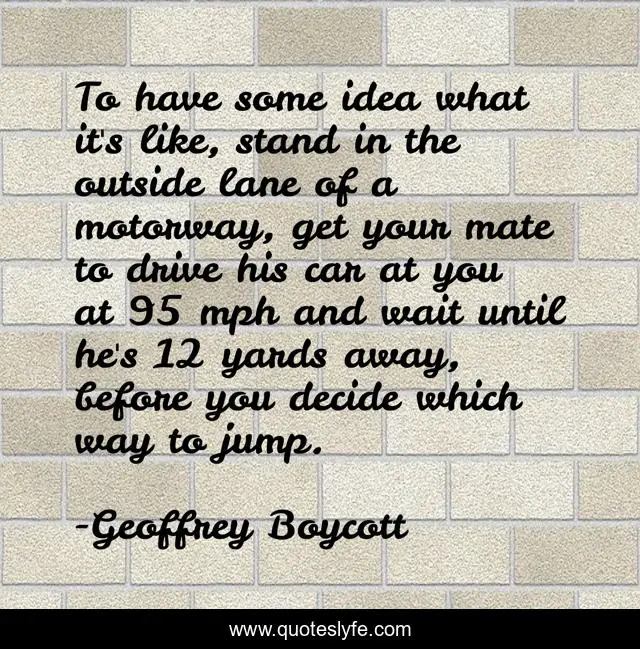 This page presents the quote "To have some idea what it's like, stand in the outside lane of a motorway, get your mate to drive his car at you at 95 mph and wait until he's 12 yards away, before you decide which way to jump.". Author of this quote is Geoffrey Boycott. This quote is about stand, drive,.