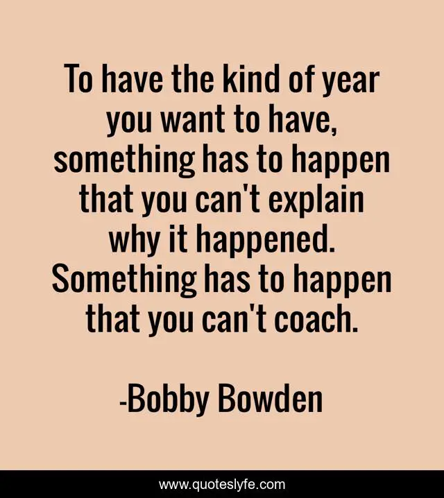 This page presents the quote "To have the kind of year you want to have, something has to happen that you can't explain why it happened. Something has to happen that you can't coach.". Author of this quote is Bobby Bowden. .