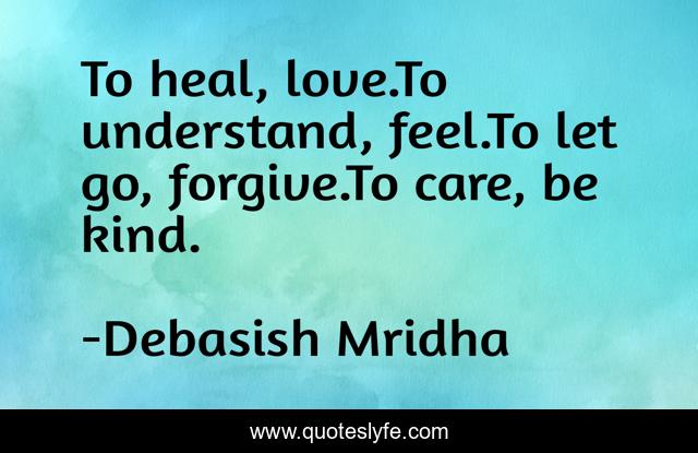 This page presents the quote "To heal, love.To understand, feel.To let go, forgive.To care, be kind.". Author of this quote is Debasish Mridha. This quote is about debasish, poetry, mridha, heal, philosophy, debasish-mridha, forgive, be-kind, understand,.