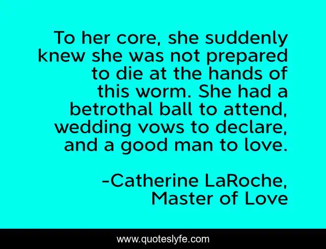 This page presents the quote "To her core, she suddenly knew she was not prepared to die at the hands of this worm. She had a betrothal ball to attend, wedding vows to declare, and a good man to love.". Author of this quote is Catherine LaRoche, Master of Love. This quote is about catherine-laroche, master-of-love, callista,.