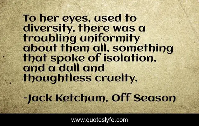 This page presents the quote "To her eyes, used to diversity, there was a troubling uniformity about them all, something that spoke of isolation, and a dull and thoughtless cruelty.". Author of this quote is Jack Ketchum, Off Season. .