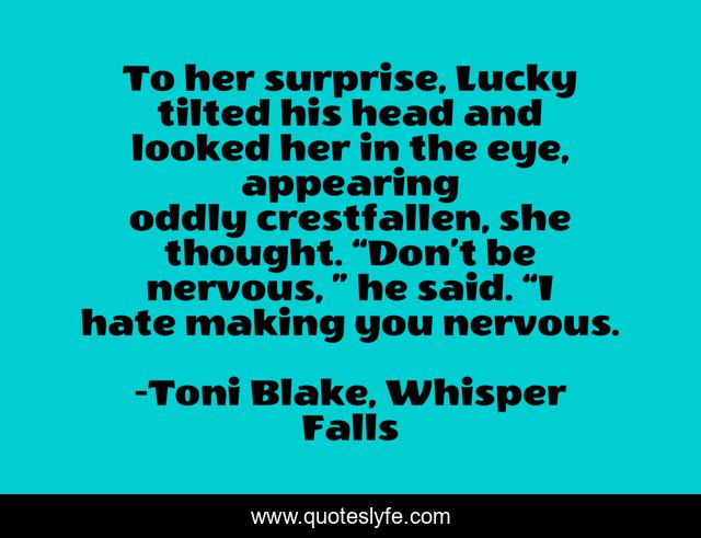 "Toni Blake, Whisper Falls Quotes." Quoteslyfe.com, 2025. Mon. 08 Dec. 2025. <https://www.quoteslyfe.com/quote/To-her-surprise-Lucky-tilted-his-head-18484>.