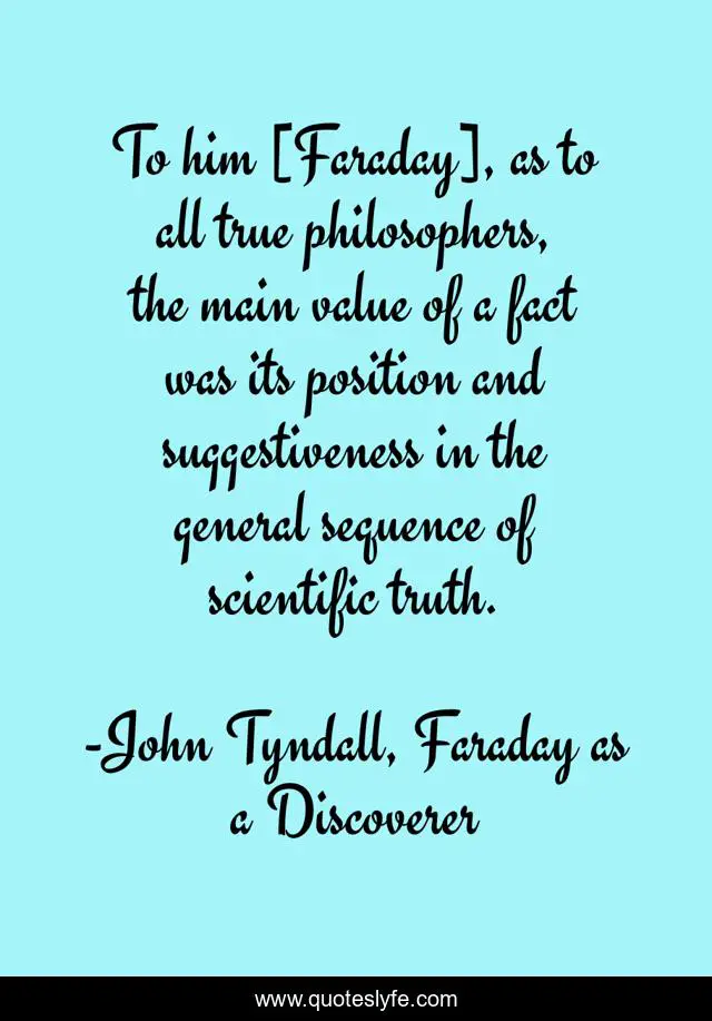 This page presents the quote "To him [Faraday], as to all true philosophers, the main value of a fact was its position and suggestiveness in the general sequence of scientific truth.". Author of this quote is John Tyndall, Faraday as a Discoverer. This quote is about scientific-truth, science, michael-faraday, value, philosopher, truth, faraday, fact,.
