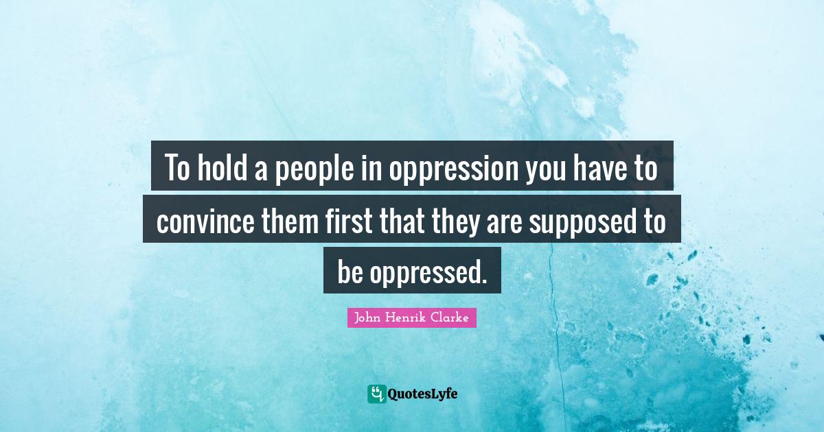This page presents the quote "To hold a people in oppression you have to convince them first that they are supposed to be oppressed.". Author of this quote is John Henrik Clarke. This quote is about supposed to be, firsts, oppression, oppressed, people, convince,.