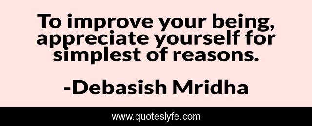 This page presents the quote "To improve your being, appreciate yourself for simplest of reasons.". Author of this quote is Debasish Mridha. This quote is about life-wisdom, philosophy, debasish-mridha, appreciate-yourself, quotes, self-improvement, inspirational, enthusiasm, debasish-mridha-m-d,.