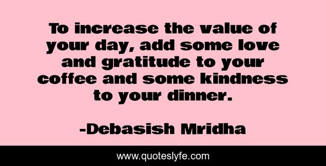 This page presents the quote "To increase the value of your day, add some love and gratitude to your coffee and some kindness to your dinner.". Author of this quote is Debasish Mridha. This quote is about gratitude, love, life-wisdom, philosophy, debasish-mridha, quotes, inspirational, how-to-improve-your-day, enthusiasm,.