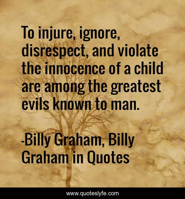 This page presents the quote "To injure, ignore, disrespect, and violate the innocence of a child are among the greatest evils known to man.". Author of this quote is Billy Graham, Billy Graham in Quotes. This quote is about children, billy-graham,.