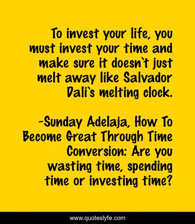 This page presents the quote "To invest your life, you must invest your time and make sure it doesn’t just melt away like Salvador Dali’s melting clock.". Author of this quote is Sunday Adelaja, How To Become Great Through Time Conversion: Are you wasting time, spending time or investing time?. This quote is about life-investment, wasting-life, life, investment, conversion, productivity, wealth, time-investment, greatness,.