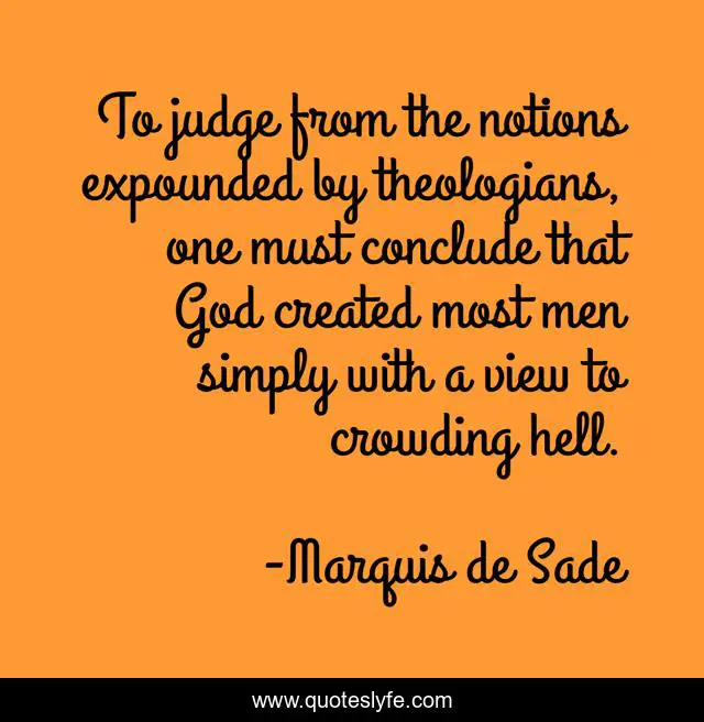 This page presents the quote "To judge from the notions expounded by theologians, one must conclude that God created most men simply with a view to crowding hell.". Author of this quote is Marquis de Sade. This quote is about atheism, god, religion,.