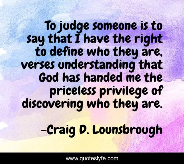 This page presents the quote "To judge someone is to say that I have the right to define who they are, verses understanding that God has handed me the priceless privilege of discovering who they are.". Author of this quote is Craig D. Lounsbrough. This quote is about people, god, judging, appreciate, discover, discovering, understanding, judgement, privilege,.