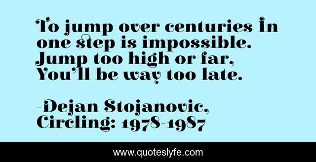 This page presents the quote "To jump over centuries In one step is impossible. Jump too high or far, You’ll be way too late.". Author of this quote is Dejan Stojanovic, Circling: 1978-1987. This quote is about high, too-far, literature, centuries, century, one-step, dejan-stojanovic, poetry, wisdom,.