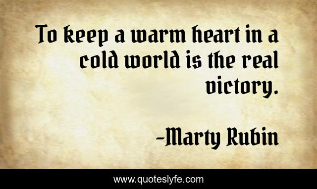 This page presents the quote "To keep a warm heart in a cold world is the real victory.". Author of this quote is Marty Rubin. This quote is about heart, coldness, warmth, success,.
