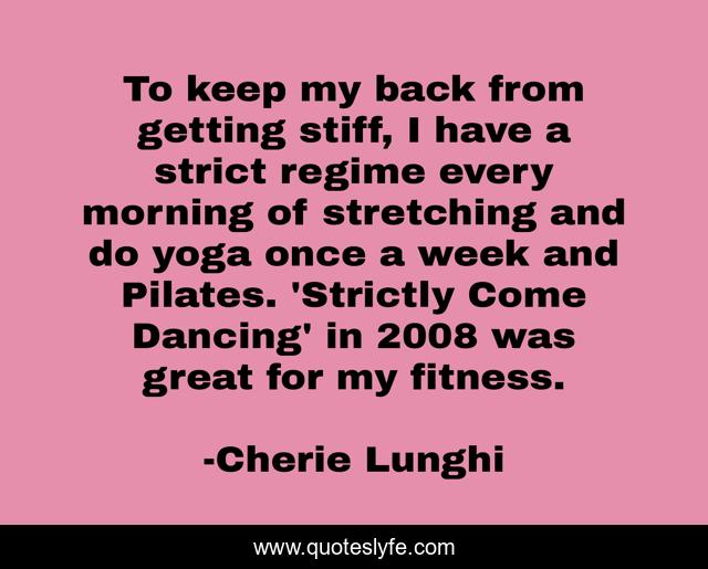 This page presents the quote "To keep my back from getting stiff, I have a strict regime every morning of stretching and do yoga once a week and Pilates. 'Strictly Come Dancing' in 2008 was great for my fitness.". Author of this quote is Cherie Lunghi. This quote is about week, great, fitness,.